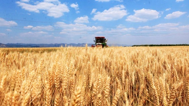 5月24日,山东省临沂市平邑县农民驾驶收割机收割小麦。新华社发(武纪全摄)